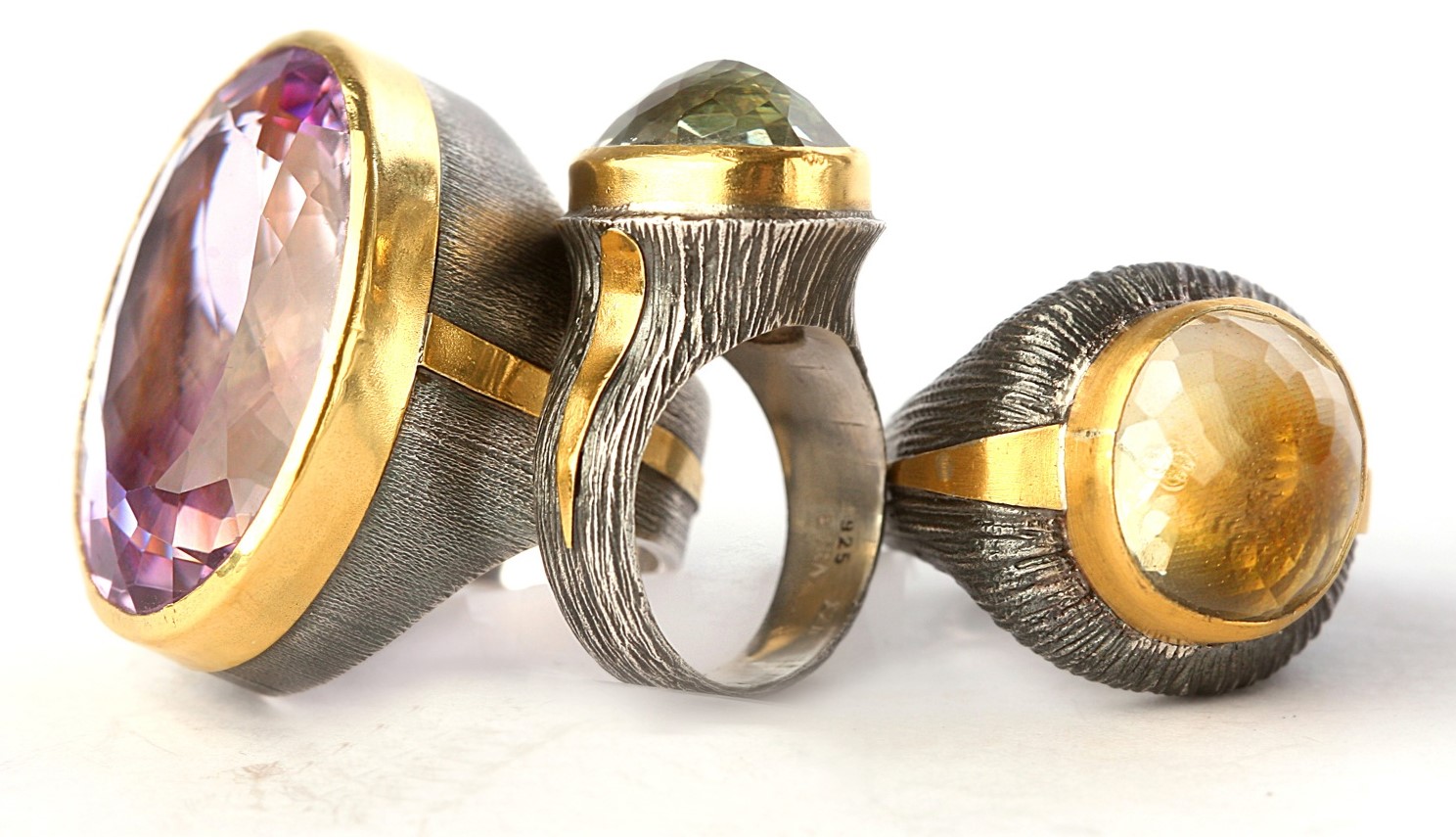 We work with oxidized silver, 22k gold, and semi-precious stones — bringing together time-honored metalsmithing traditions with a deeply personal aesthetic vision.